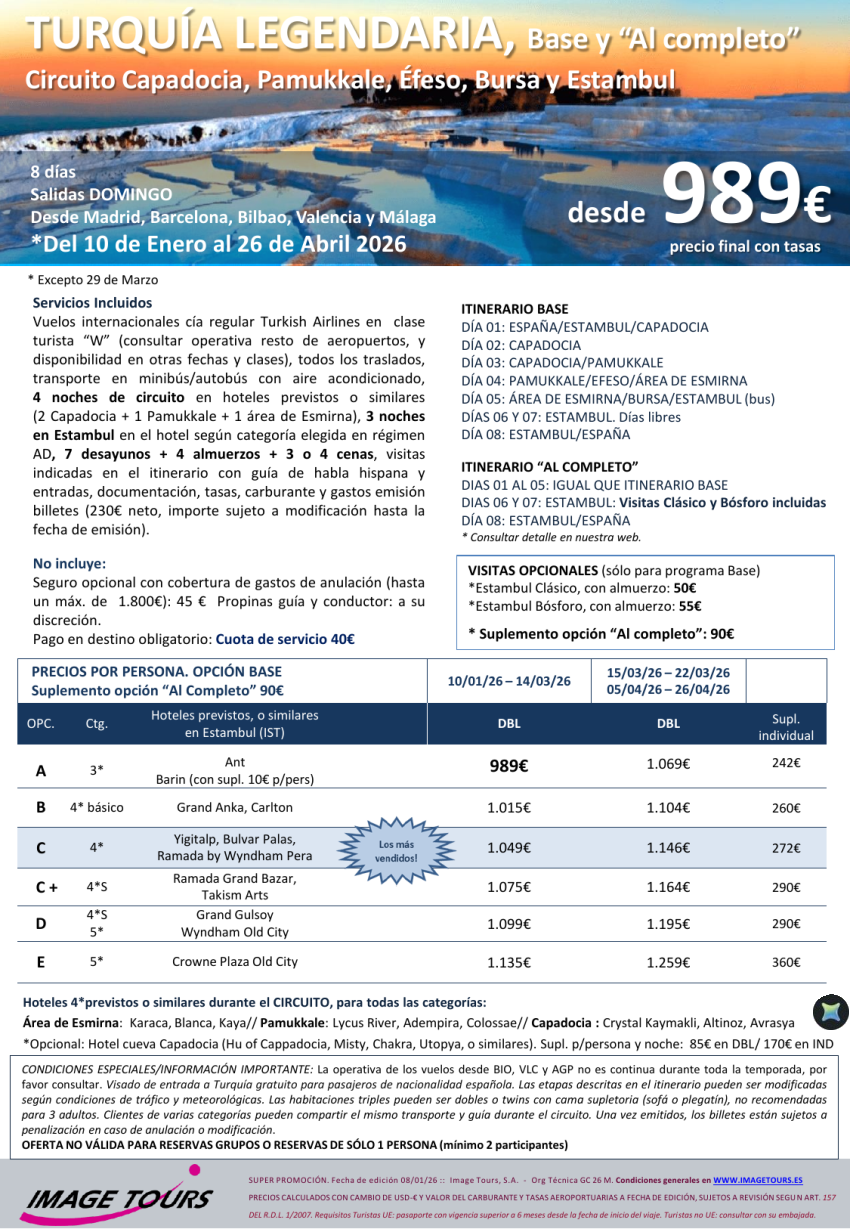 TURQUIA Legendaria desde Capadocia, con Pamukkale, Efeso, Esmirna, Bursa y Estambul, desde 989€ hasta Abril