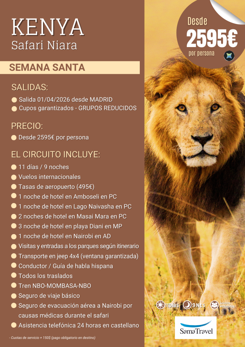 Kenya Semana Santa "Safari Niara+Playa": 11 días con visitas y playa Diani, Nairobi (01ABR) *Desde 2.595€*