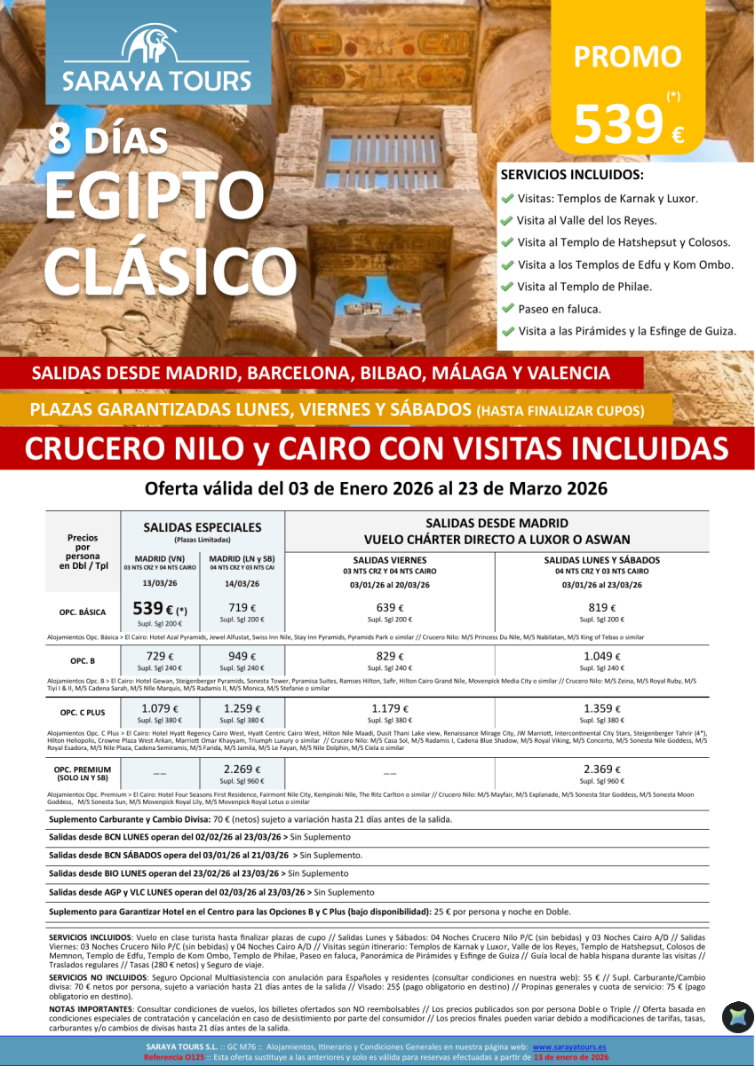 Egipto Clásico 8 días. *Salidas Bcn, Mad ,Agp ,Bio & Vlc * Crucero y Cairo + visitas dsd 499€ hasta Dic26